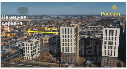Квартира расположена на 16 этаже, что дает хороший обзор, больше света и ощущение приватности. Из окон открывается красивый вид на Немецкую деревню и частный сектор — без высотной застройки перед окнами.