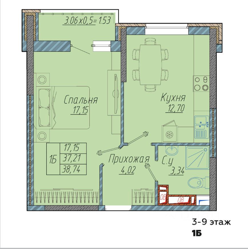 Общая площадь38,74 м²