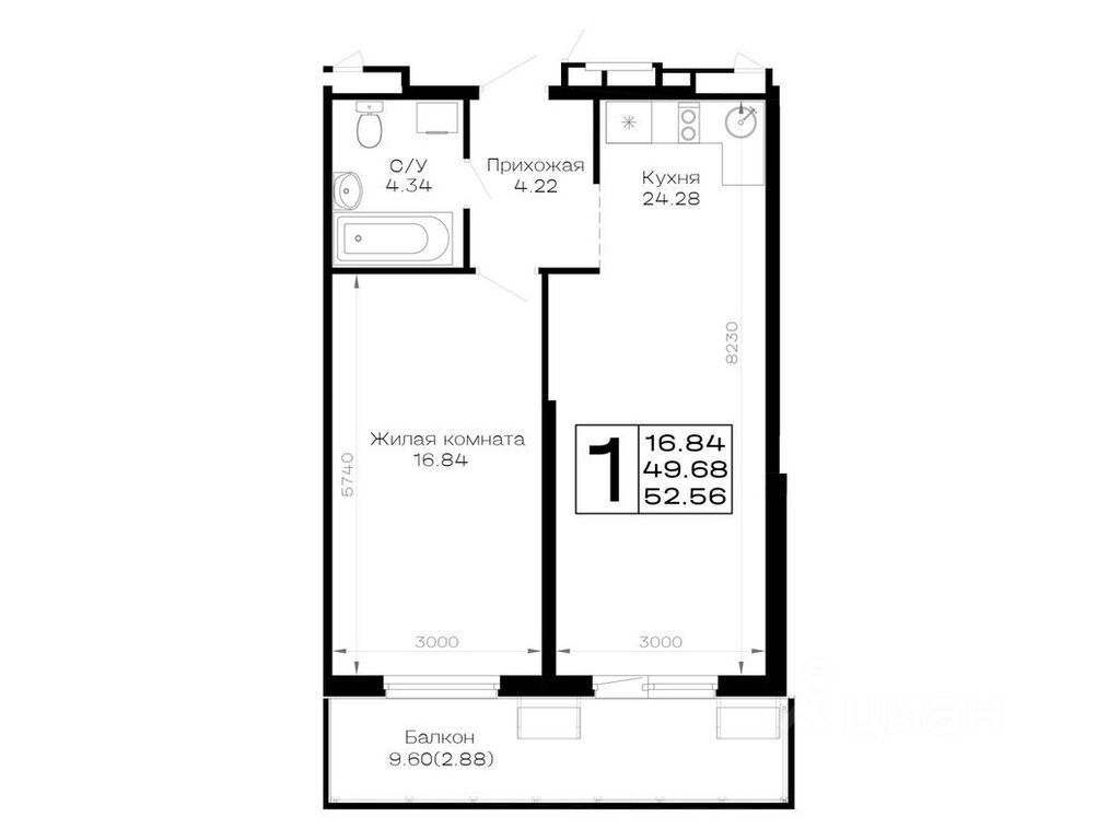 Общая площадь52,56 м²