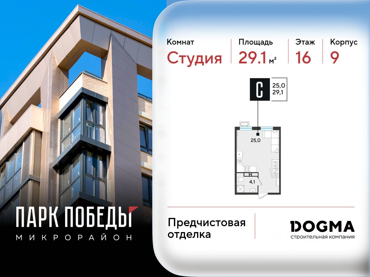 Срок сдачи: 3 кв. 2026, общей площадью 29.1 кв.м., на 16 этаже.