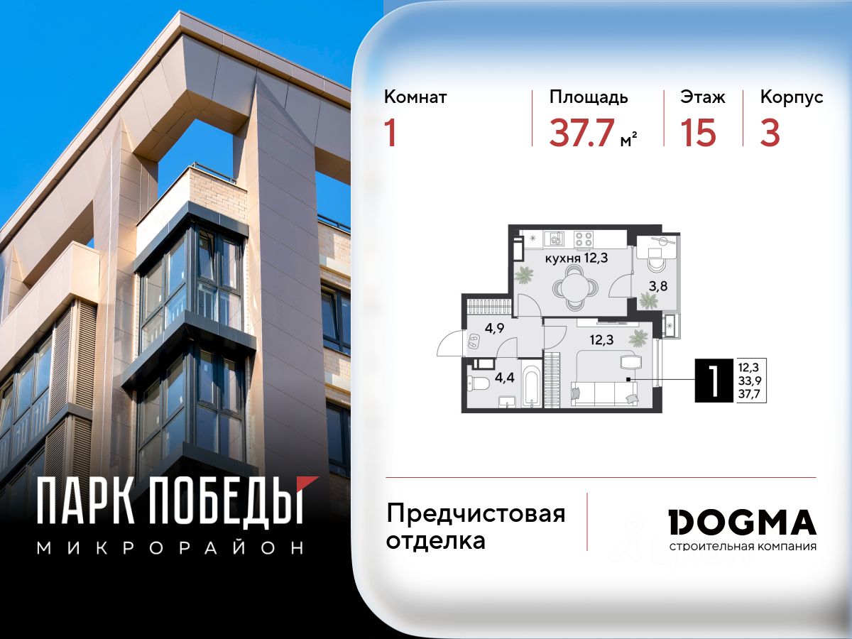 Срок сдачи: 2 кв. 2026, общей площадью 37.7 кв.м., на 15 этаже.