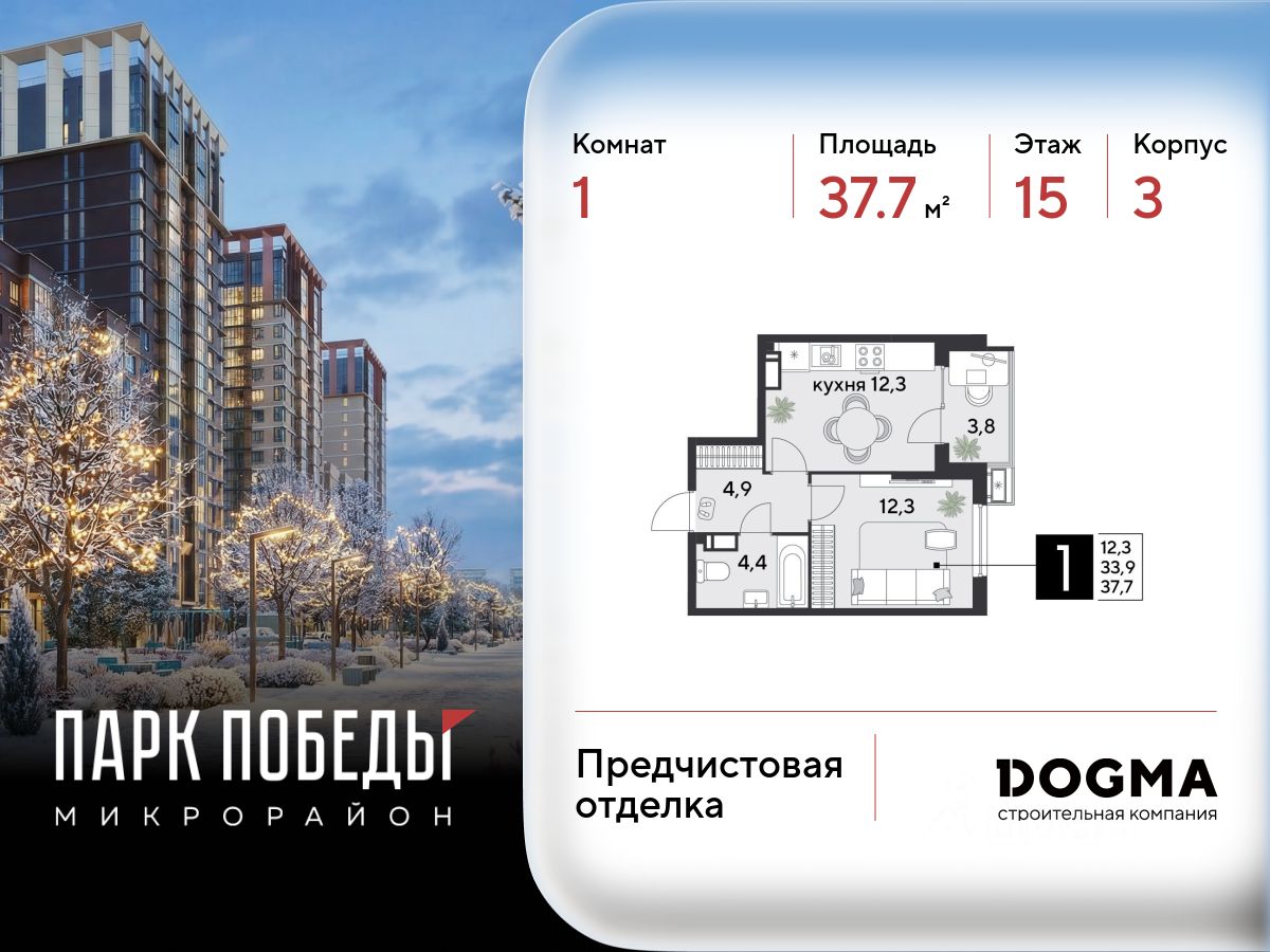 Срок сдачи: 2 кв. 2026, общей площадью 37.7 кв.м., на 15 этаже.