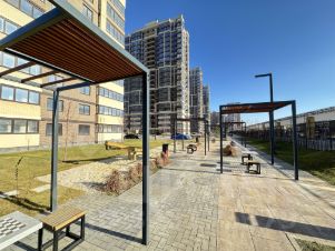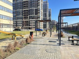 На территории выполнен ландшафтный дизайн, который придает изюминку этому жилому комплексу. Организована шикарная детская площадка, имеются тренажеры для занятий спортом.