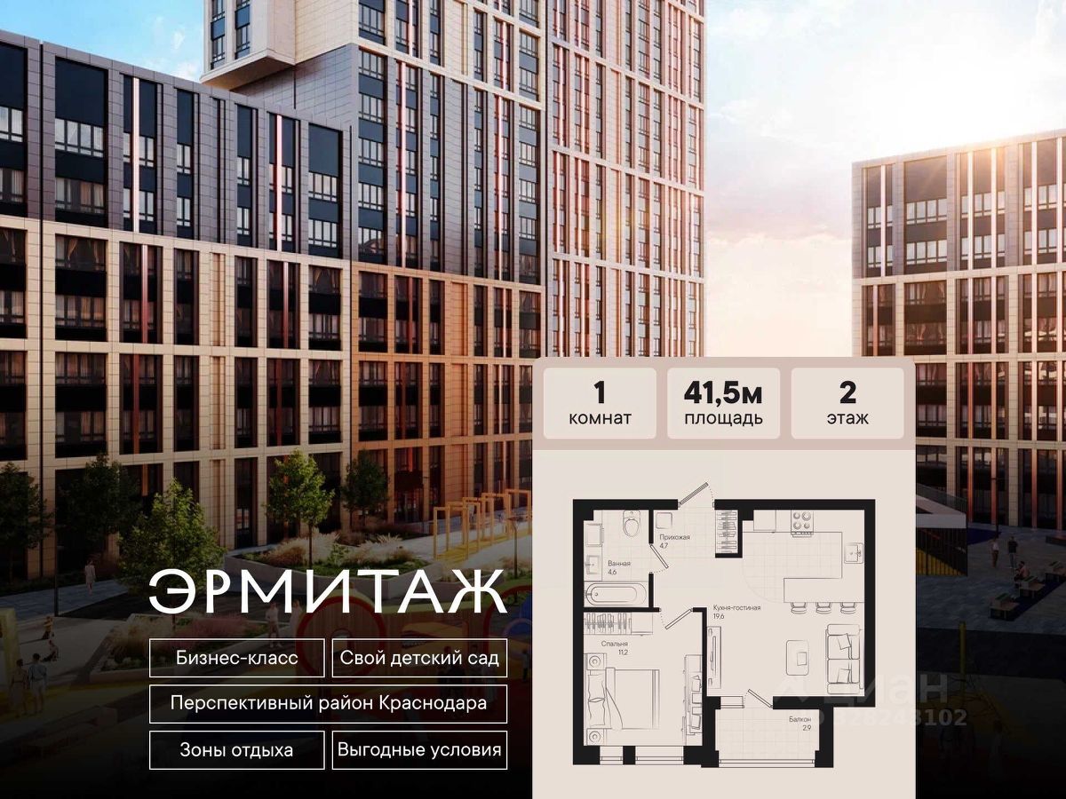 Квартира, вдохновленная искусством Добро пожаловать в "Эрмитаж" — первый культурный квартал Краснодара. Это не просто жилой комплекс, а настоящее произведение архитектурного искусства. Каждая деталь здесь продумана до мелочей: от перформанс-дворов в стиле Малевича и Кандинского до зелёных аллей, где хочется гулять вечерами. Это ваш шанс жить в окружении красоты, тишины и эстетики. Только сейчас — специальные условия от застройщика: Комбо-ипотека: расширили лимит! Ипотека 13.9% на весь срок для всех! Скидка до 297000 ₽ на квартиры всем молодоженам при предъявлении свидетельства о заключение брака не более чем 1 год назад. Ипотека 6% Скидка до 20 000 р/м2 в ЖК "Эрмитаж" Поддержка работников образовательных учереждений, здравохранения, студентов, участников СВО Что вы получаете с "Эрмитажем": Уникальный дизайн и архитектура — каждый двор как галерея Закрытая территория — безопасно и уютно Резиденции для тех, кто ценит комфорт, статус и эстетику Персональные предложения Возможность инвестировать в недвижимость премиум-уровня — на условиях, выгоднее банковских вкладов Что говорят наши покупатели? "Это не просто жилье, это атмосфера. Купили здесь квартиру и поняли, что сделали правильный выбор: красивый двор, тишина, безопасно. Всё, как и обещали." Оставьте заявку, и наш менеджер свяжется с вами в течение 10 минут — всё расскажет и рассчитает вашу выгоду. Добавьте в избранное, чтобы не потерять это предложение.