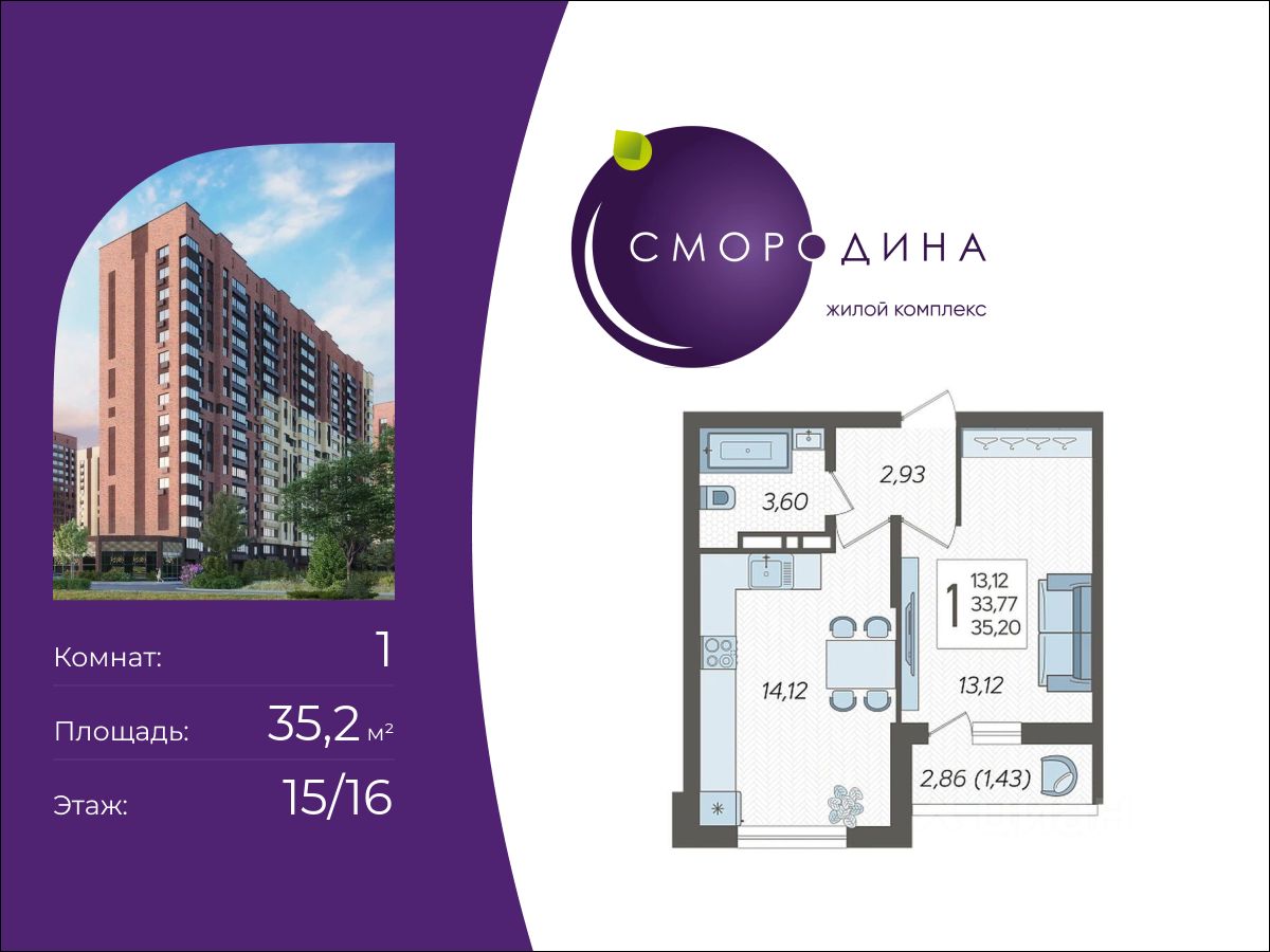 В продаже 1-комнатная квартира площадью 35.2 кв. м, расположенная 12 жилого комплекса комфорт-класса "Смородина". Комплекс от девелопера AVA находится на востоке Краснодара, в Новознаменском районе.