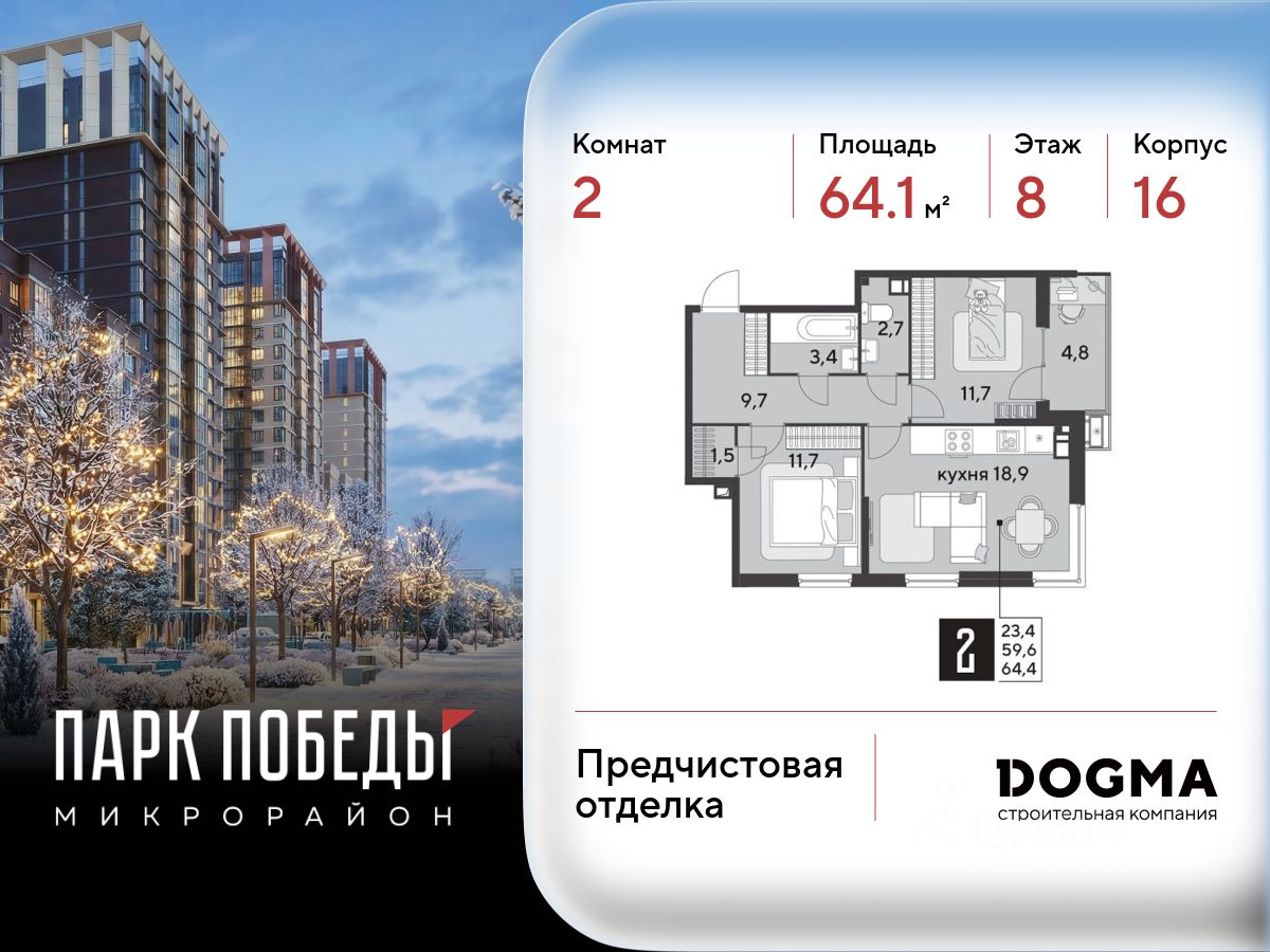 Срок сдачи: 2 кв. 2026, общей площадью 64.1 кв.м., на 8 этаже.