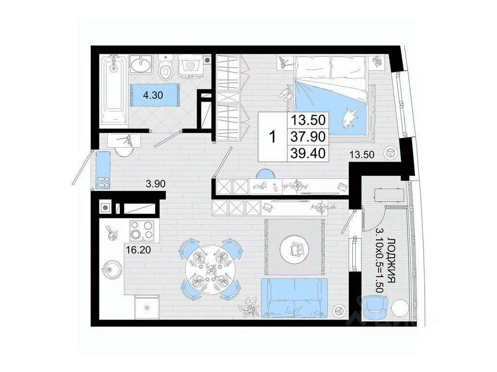 Общая площадь39,4 м²