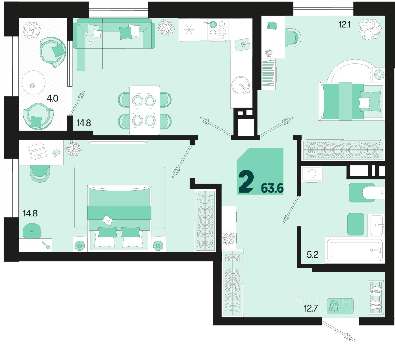 Продаётся 2-комнатная квартира в строящемся доме (Квартал 1.1 - Литер 1), срок сдачи: IV-кв. 2026, общей площадью 61.6 кв.м., на 8 этаже. Жилой район "Первое