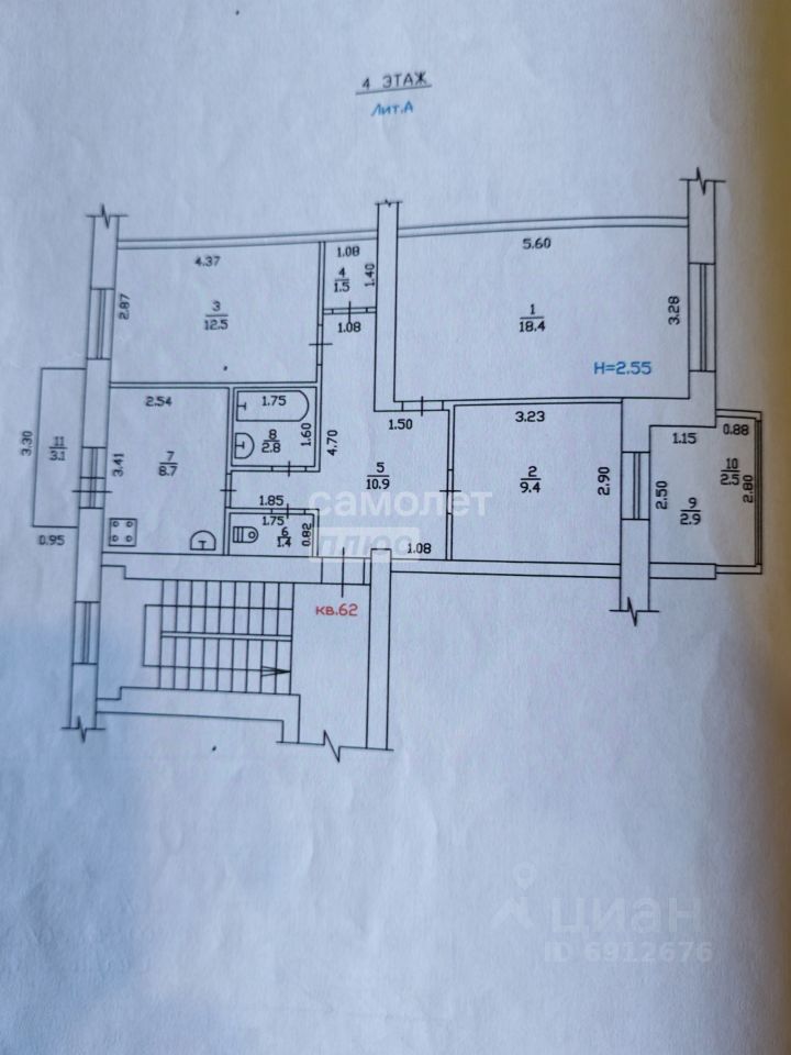 Квартира 65,6 кв метров расположена на 4ом этаже 5ти этажного дома.