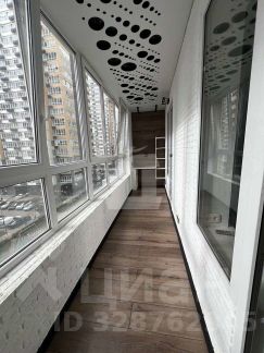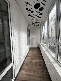 На кухне располагается кулинарная зона с барной стойкой, диван для отдыха и ТВ-зона. Жилая комната просторная 16 м2 имеет выход на остекленную ленточную лоджию. На лоджии оборудовано рабочее место. Есть гардеробная для хранения вещей.