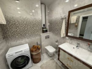 Тёплые полы для комфорта в любое время года. В ванной установлен водонагреватель на 50 литров.