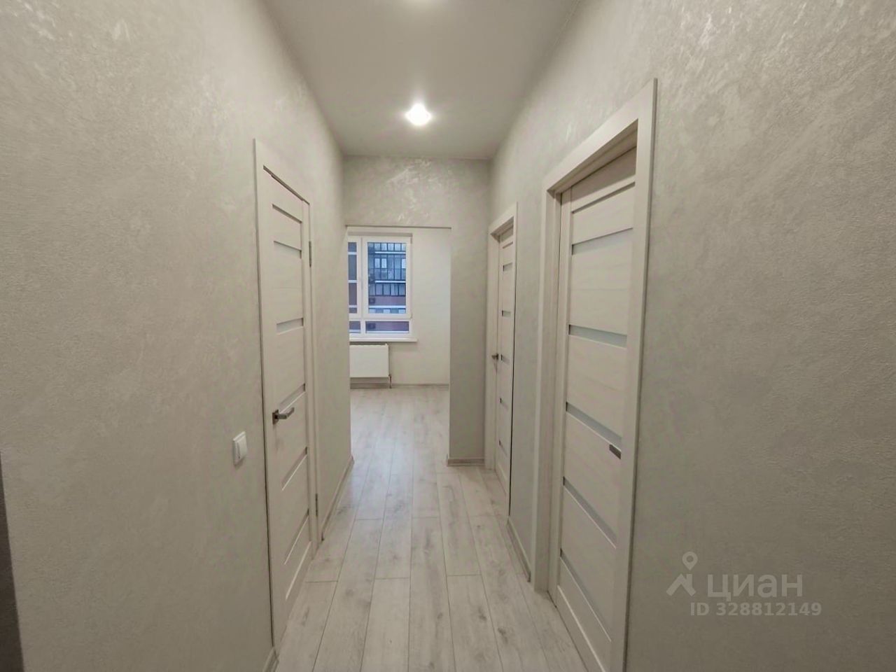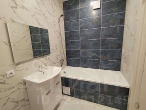 На полу ламинат, обои светлого нейтрального оттенка, белые матовые натяжные потолки с точечными светильниками. Санузел в контрастной плитке под мрамор. Балкон отделан, остеклен.