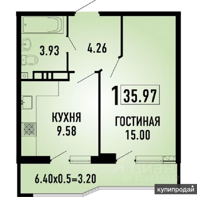 Площадь 36 кв. м, жилая площадь — 15 кв. м, кухня — 10 кв. м, большая лоджия с выходом из комнаты и кухни площадью - 6,40 м.кв.