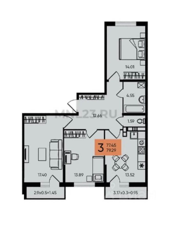 Площадь квартиры - 77.7 м2 по выписке ЕГРН+ 2 застекленных балкона по 3 м2.