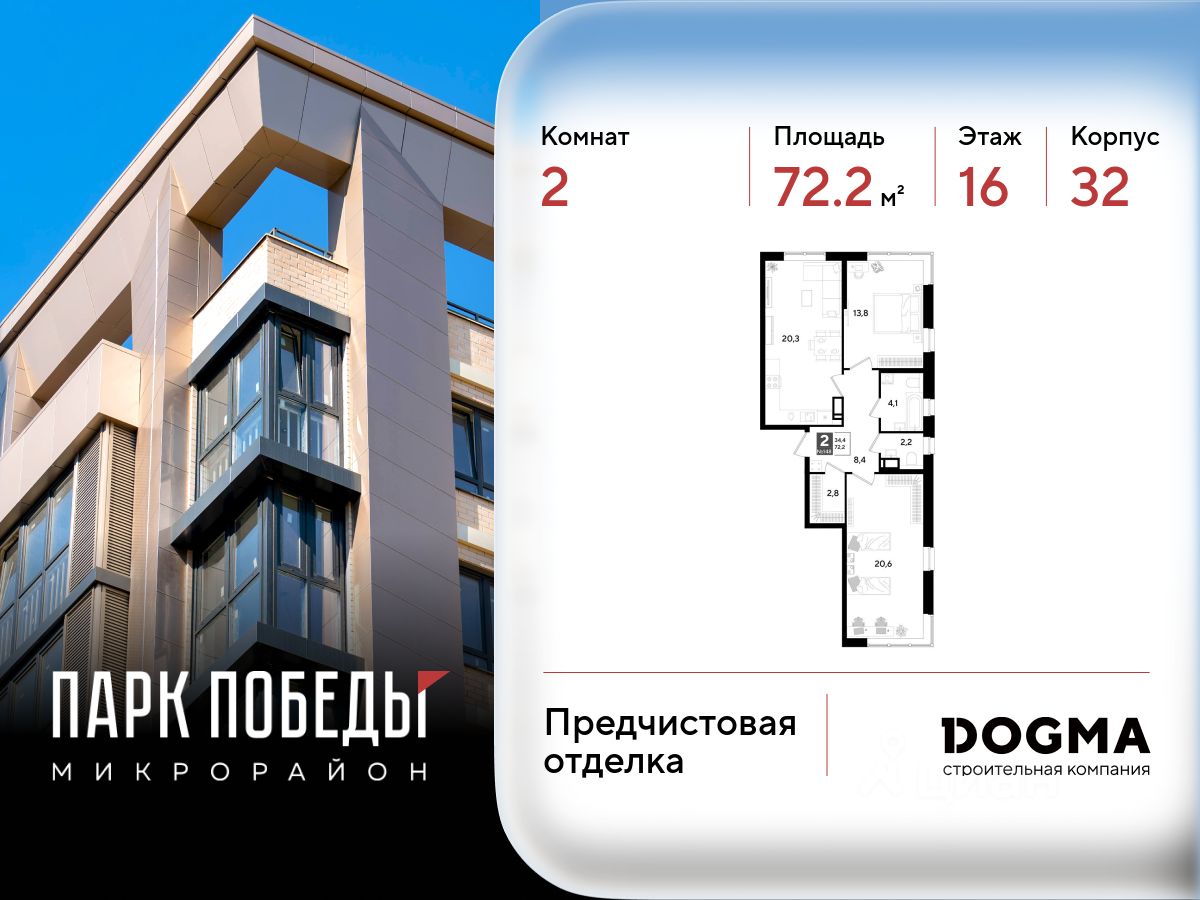 Срок сдачи: 3 кв. 2026, общей площадью 72.2 кв.м., на 16 этаже.