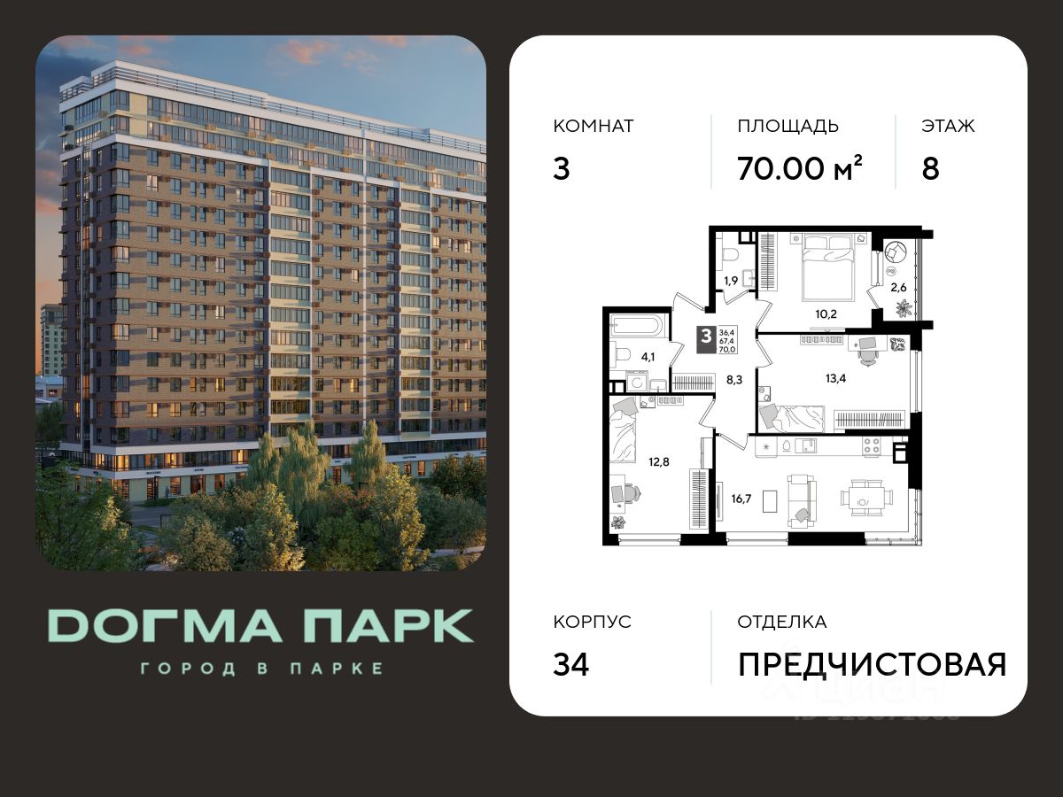 В продаже 3-комнатная квартира от застройщика! Мкр. "ДОГМА ПАРК" г. Краснодар, Литер 30 Срок сдачи: 2 кв. 2027, общей площадью 70.00 кв.м., на 8 этаже.
