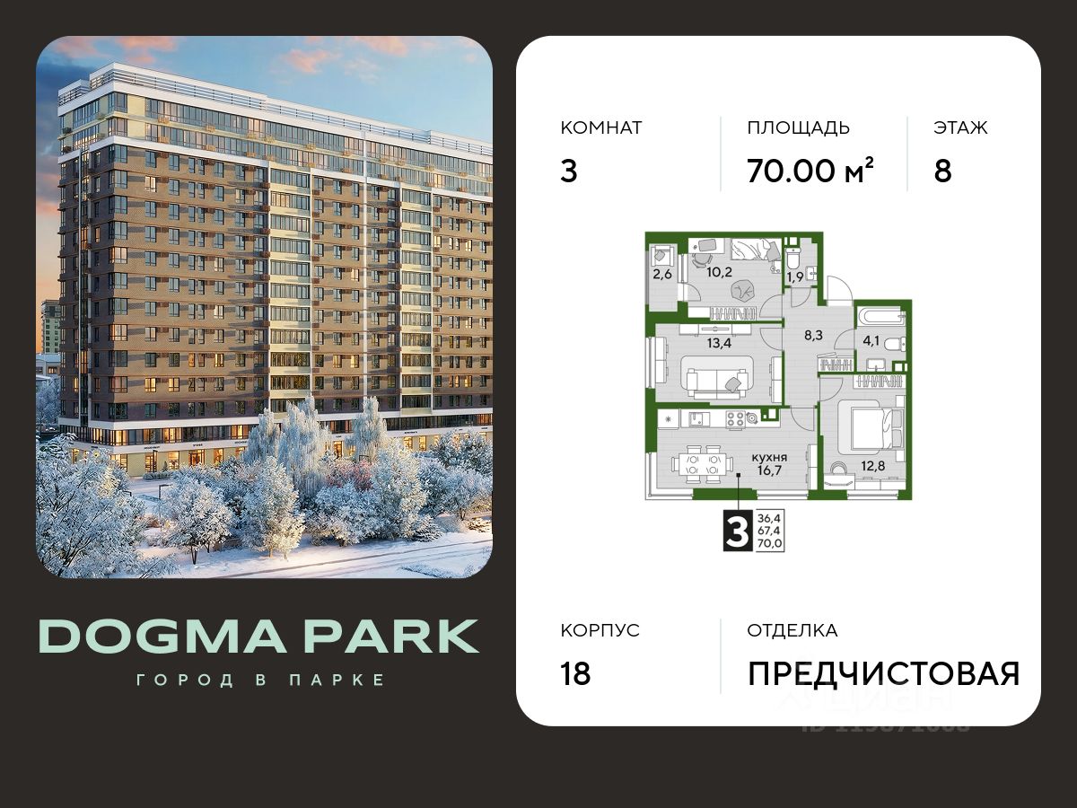 В продаже 3-комнатная квартира от застройщика! Мкр. "ДОГМА ПАРК" г. Краснодар, Литер 34 Срок сдачи: 2 кв. 2027, общей площадью 70.00 кв.м., на 8 этаже.