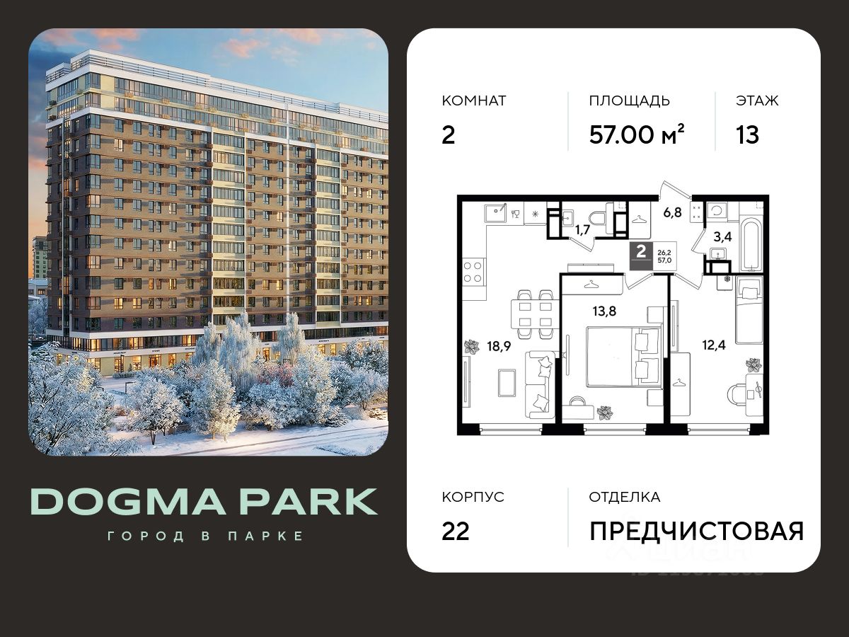 В продаже 2-комнатная квартира от застройщика! Мкр. "ДОГМА ПАРК" г. Краснодар, Литер 36 Срок сдачи: 2 кв. 2027, общей площадью 57.00 кв.м., на 13 этаже.
