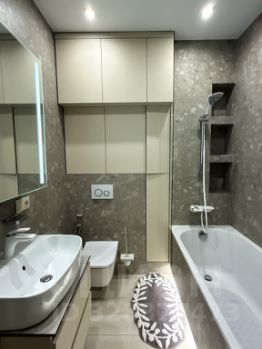 • Натяжные потолки и крупная плитка в санузле.
