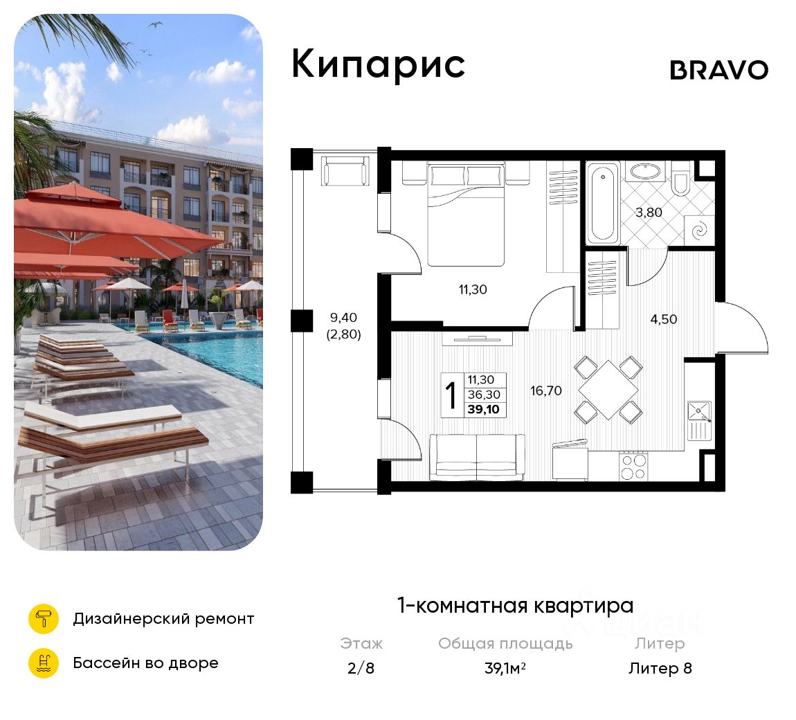 Общая площадь39,1 м²