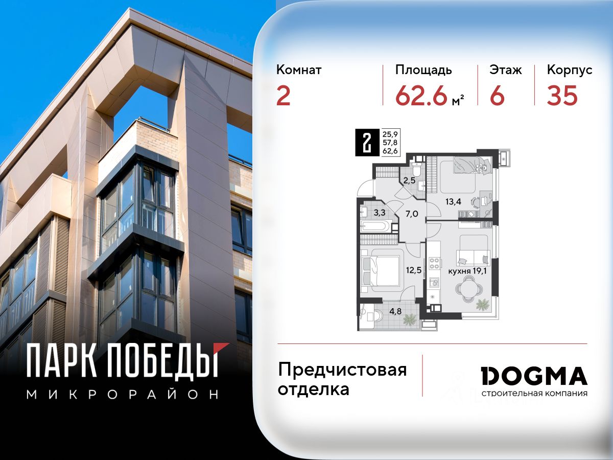 Срок сдачи: 3 кв. 2026, общей площадью 62.6 кв.м., на 6 этаже.