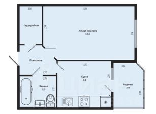 Общая площадь квартиры составляет 36.7 кв. м, из которых 16.7 кв. м — жилая, а кухня занимает 9.2 кв. м., рабочая зона кухни вынесена на балкон, что позволяет использовать, как дополнительное жилое пространство. Отлично подойдет для семьи с ребенком, у каждого будет своя комната.