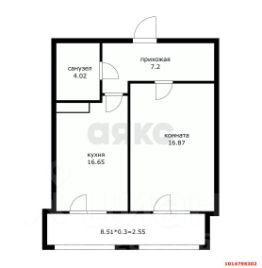 Кухня гостиная 17 м2 с выходом на застеклённую лоджию, комната 17 м2 с выходом на лоджию, лоджия 8.5 м2, прихожая с гардеробной 7.2 м2, сан. узел совмещённый 4 м2.