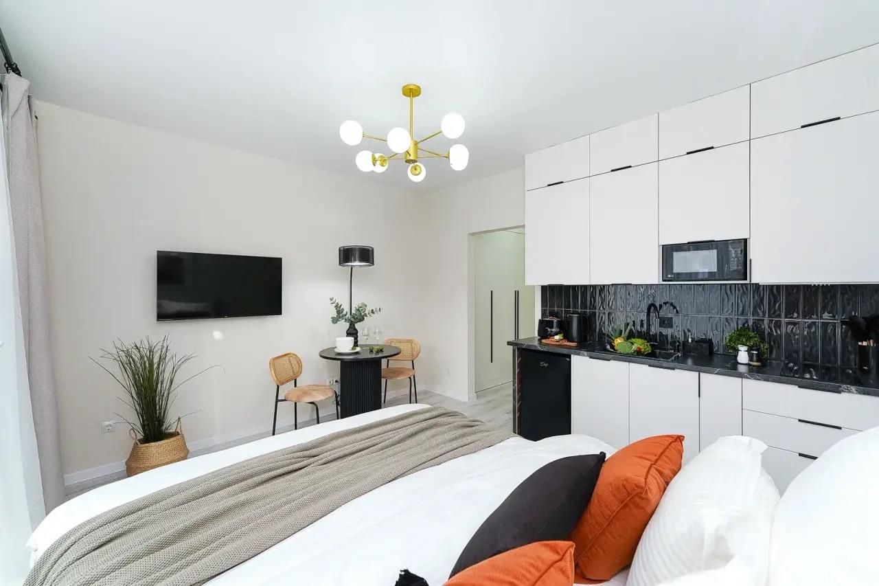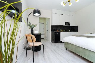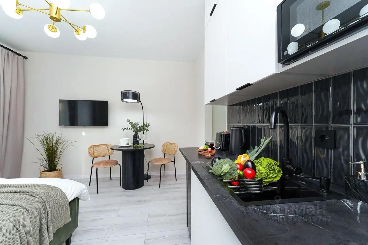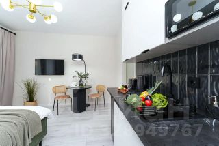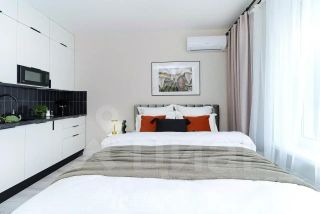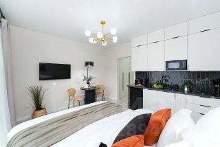 Квартира имеет дизайнерский ремонт, благодаря чему выглядит стильно и современно. Пространство студии продумано до мелочей: небольшой, но функциональный кухонный уголок площадью 4 кв.м, который идеально подходит для домашних ужинов. Совмещенный санузел выполнен в светлых тонах, что визуально увеличивает его пространство. А уютный балкон позволяет наслаждаться свежим воздухом, не покидая квартиры.