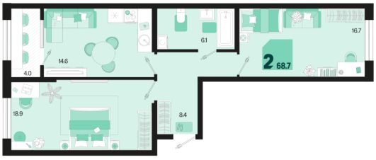 Продаётся 2-комнатная квартира в строящемся доме (Квартал 1.3 - Литер 2), срок сдачи: II-кв. 2027, общей площадью 66.7 кв.м., на 2 этаже. Жилой район "Первое
