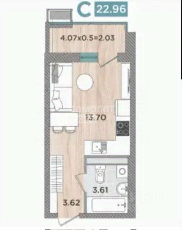 Общая площадь квартиры составляет 22,96 кв. м.