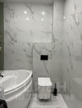 Ремонт со вкусом: санузел в кафеле, на полу — плитка ПВХ, стены оклеены обоями, натяжной потолок с точечным освещением.