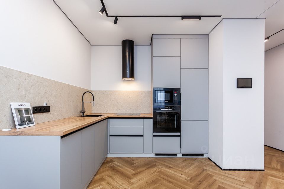 Технологичные решения: Потолок на алюминиевом профиле с трековым освещением, увеличенные подрозетники для управления светом через Алису в будущем.
