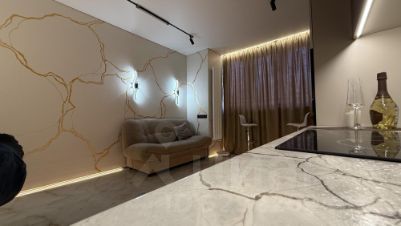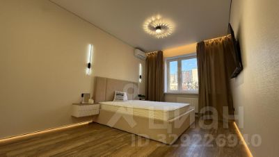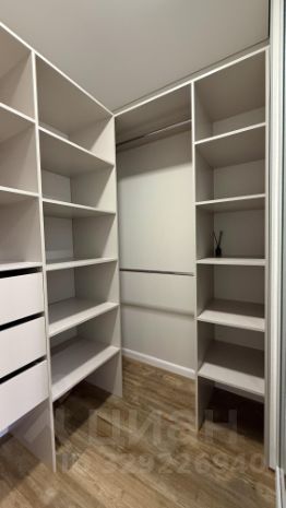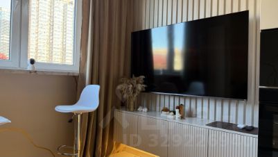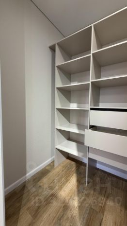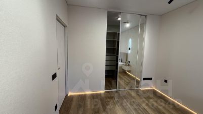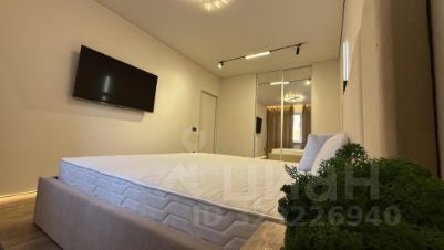 В комнате удобная кровать с дизайнерскими парящими полочками с выдвижными ящиками. Телевизор Xiaomi с диагональю 55". Есть большая ниша-гардеробная с зеркальными дверьми в потолок