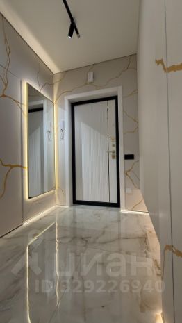 В коридоре большое зеркало с подсветкой и вместительный парящий шкаф с подсветкой