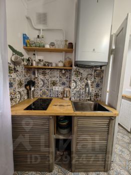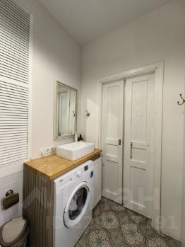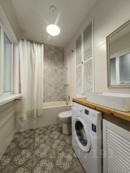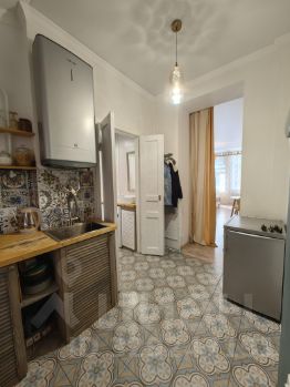 Кухня оборудована всем необходимым: холодильник, современная плита, современный бойлер и стильный фартук с ярким кафелем. В совмещенном санузле установлена стиральная машина и ванна с оригинальной плиткой, а в стене сделана просторная ниша для хранения химии и всего необходимого.