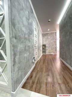 Выполнен очень качественный и дорогой ремонт, в лаконично светло-серых тонах, с использованием только лучших материалов, не экономили, не на продажу, тщательно подбирая материалы и оттенки, продумывая все до мелочей, весь коридор в декоративной штукатурке, по всему потолку квартиры установлены световые линии, разные варианты подсветки.