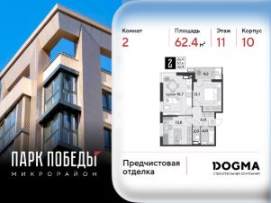 Срок сдачи: 2 кв. 2026, общей площадью 62.4 кв.м., на 11 этаже.
