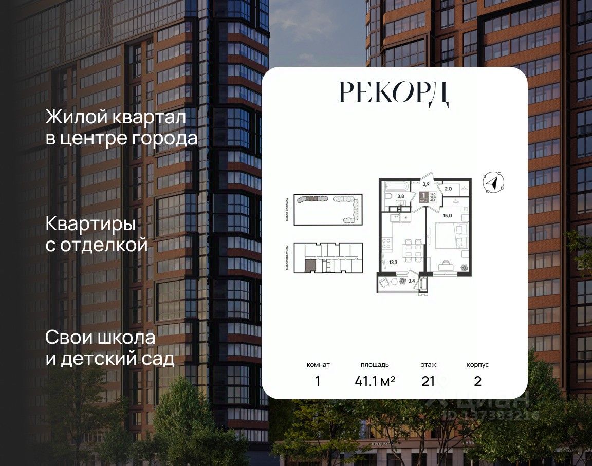 В продаже 1-к квартира от застройщика! ЖК "Рекорд" 2 очередь, г. Краснодар, Литер 2. Срок сдачи: 2 кв. 2026, общей площадью 41.1 кв.м., на 21 этаже.