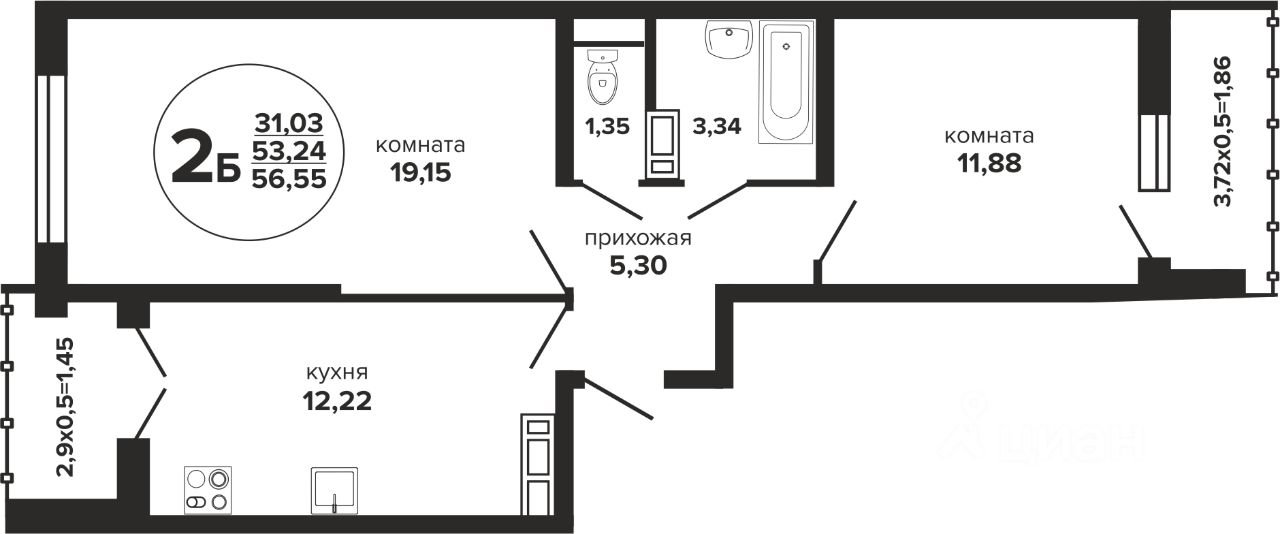 Для семьи — комфортная 2-комнатная планировка с возможностью зонирования и личного пространства для каждого;