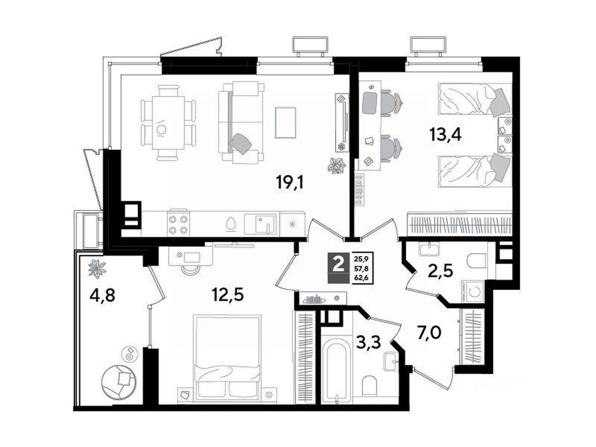 Срок сдачи: 4 кв. 2025, общей площадью 61.5 кв.м., на 4 этаже.