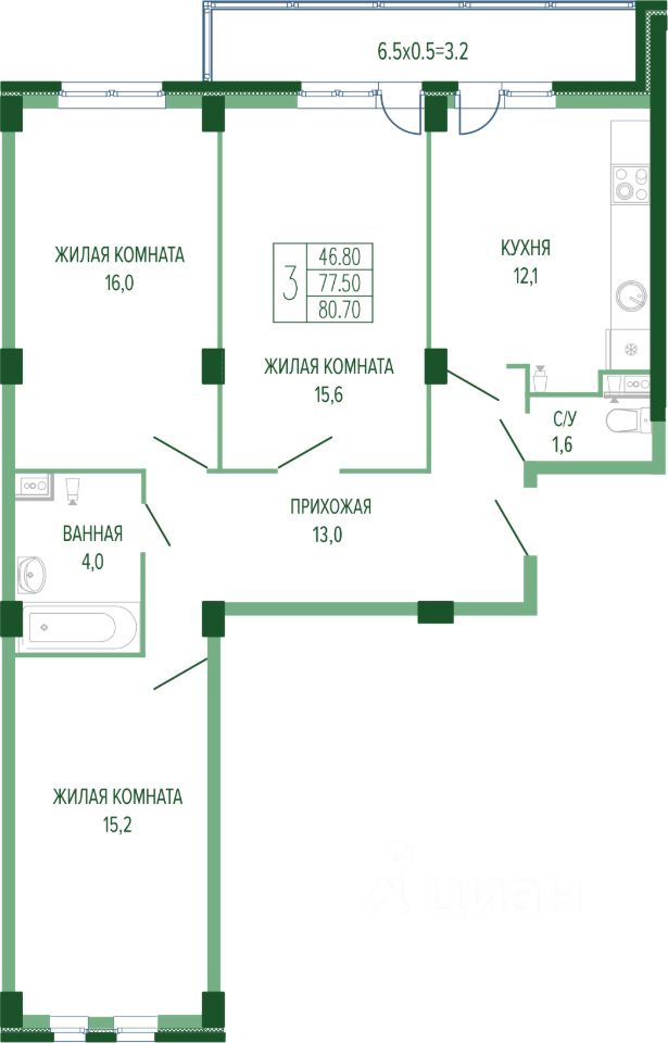 Полноценная 3-комнатная квартира с удобным разделением зон;
