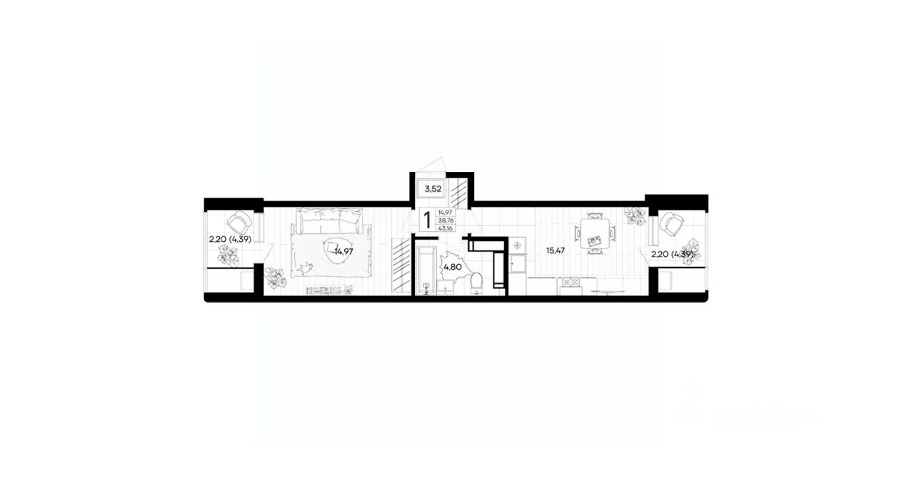 Общая площадь43,16 м²