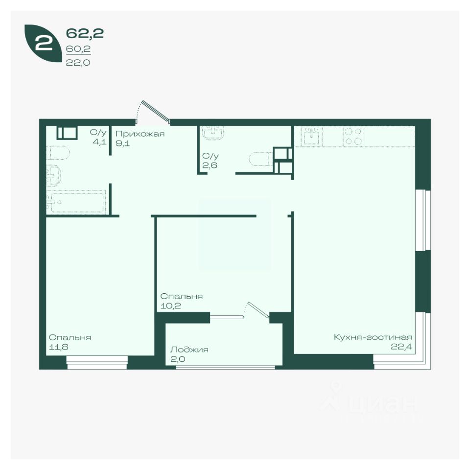 Общая площадь62,2 м²