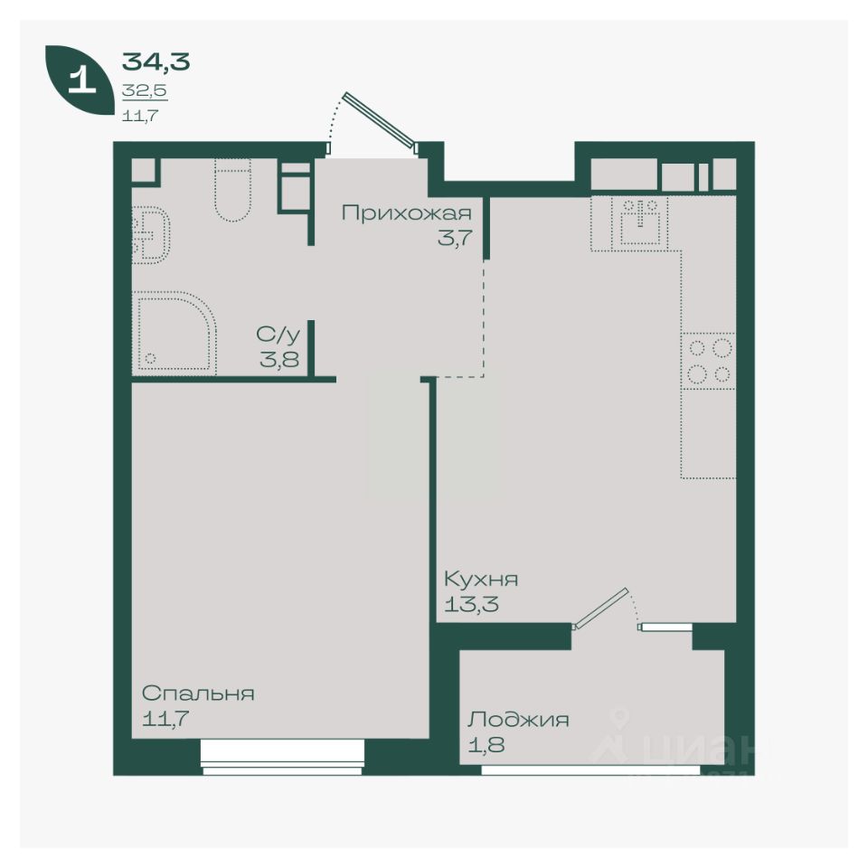 Общая площадь34,3 м²