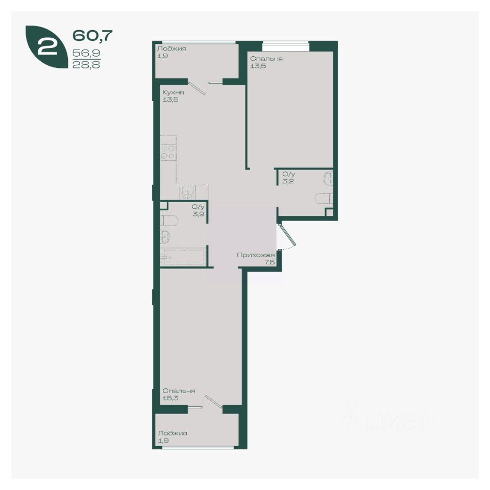 Общая площадь60,7 м²