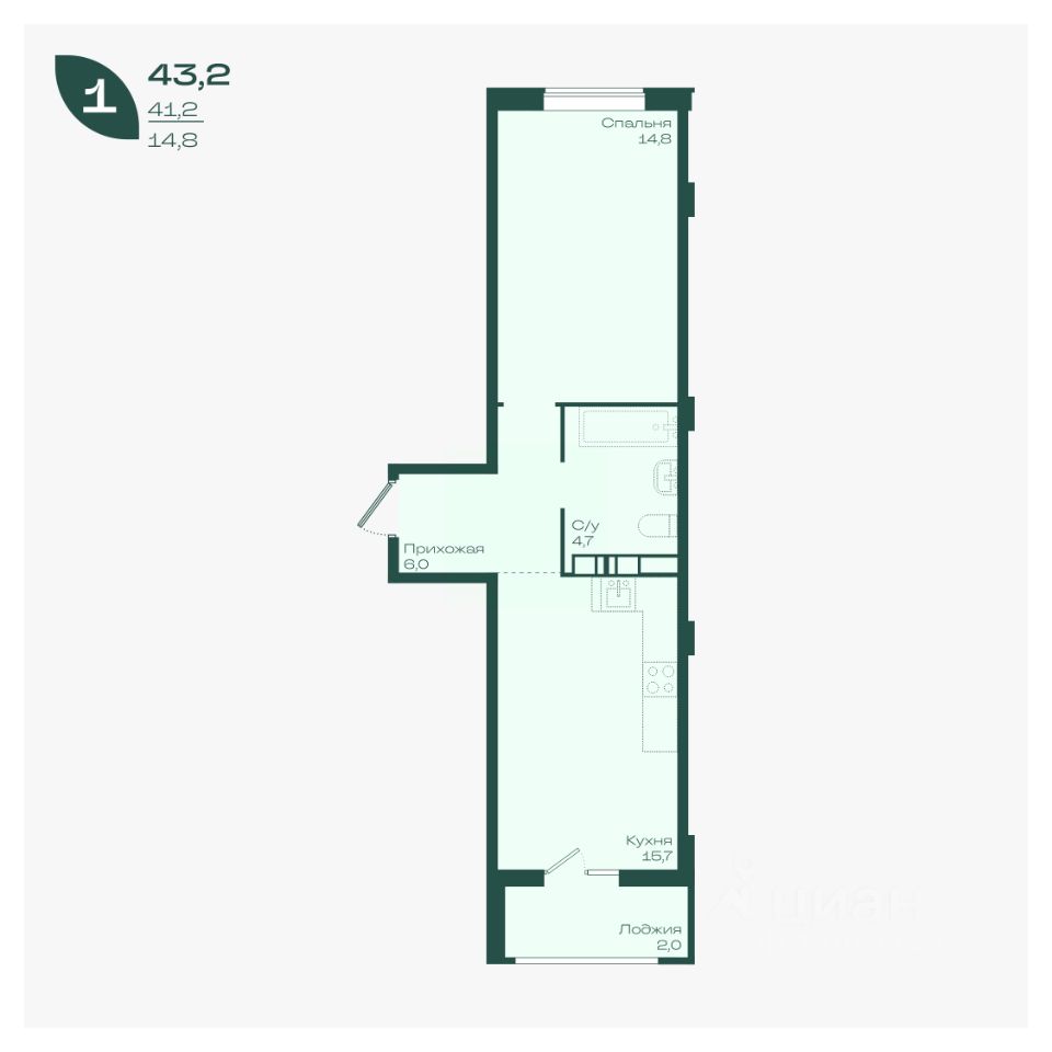 Общая площадь43,2 м²