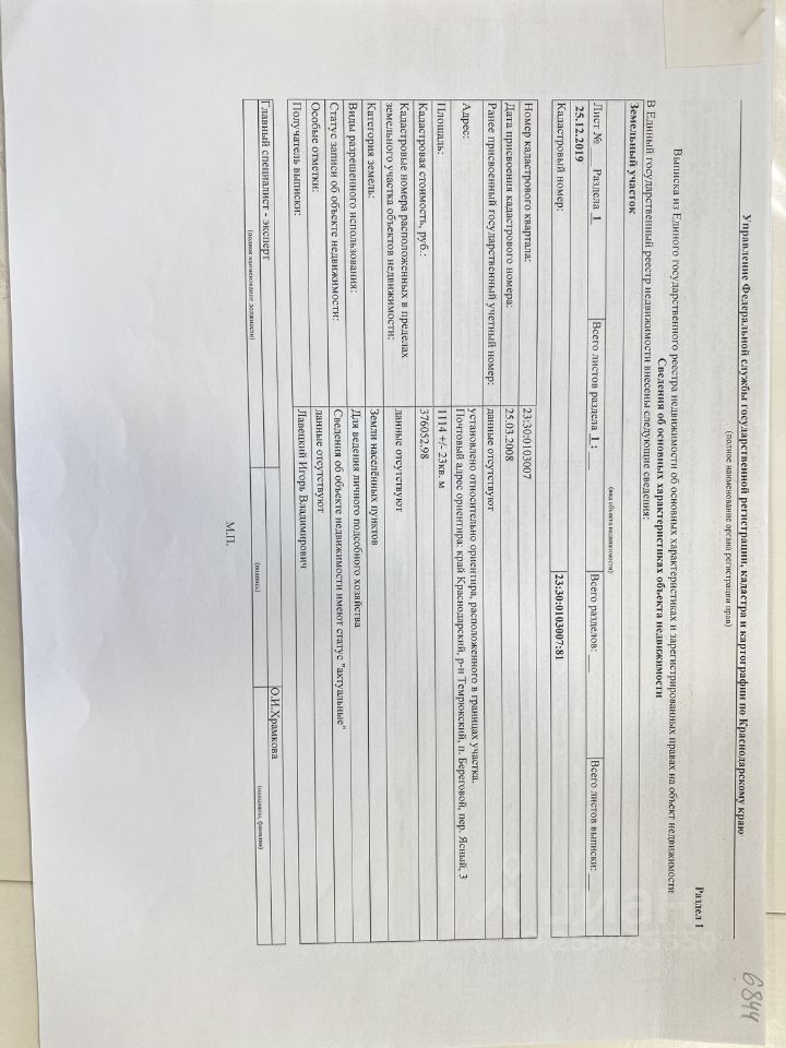Кадастровый номер участка 23:30:0103007:*** указал продавец