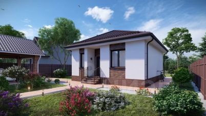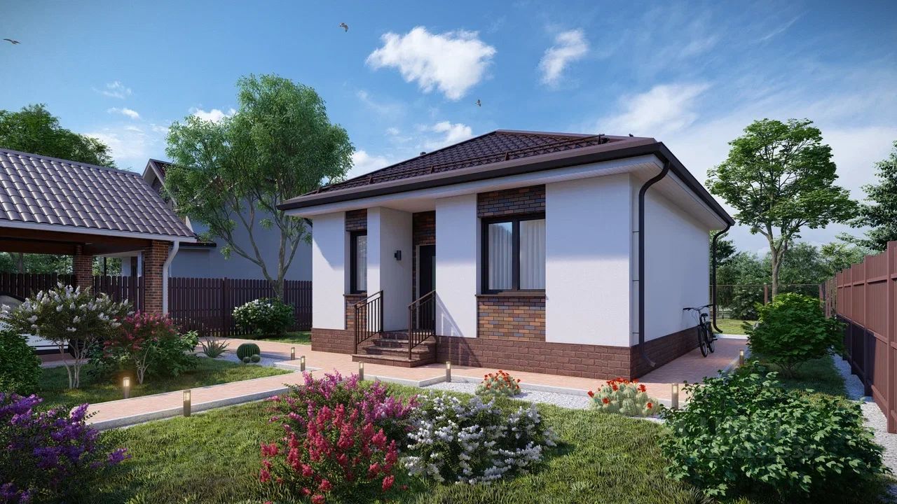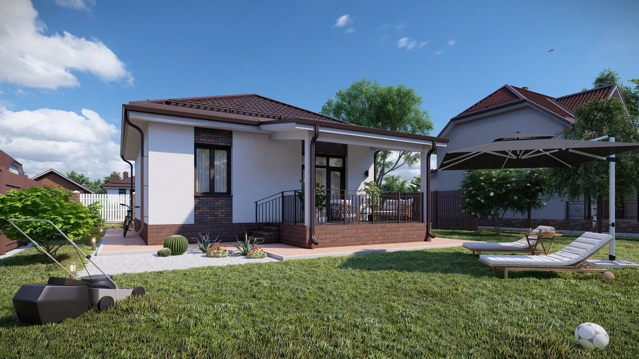 1-этажный дом с двумя спальнями, просторной кухней-гостиной с теплым полом, котельной, крыльцом, построенный на территории современного премиального коттеджного поселка (благоустройство, инфраструктура, дороги, детские и спорт площадки).