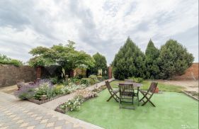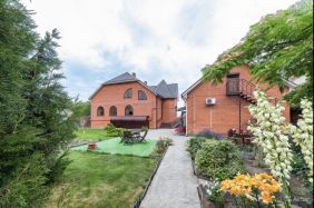 Дом гостевой в два уровня (56 м2): 7/8м, отопление автономное, кирпич бутовый, облицован итальянским полуторным кирпичом , крыша из финской металлочерепицы (дополнительное утепление, гидроизоляция, подшита доской), фундамент ленточный бетон металл, окна металл-пластик с ролетами. Планировка: столовая-кухня 4/4 м со встроенной индивидуальной мебелью, с техникой, котельная-прачечная 1/3м, стены и пол кафель, санузел 2/3м, стены и пол кафель, кладовая 1/3м пол линолеум, спальня 3/7м, потолки 3,1м гипсокартон, пол ламинат.