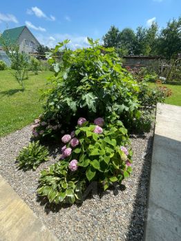 На ровном участке (20 машин земли) посажен фруктовый сад (колоновидная груша, яблони, малина, сливы, персики, инжир, вишня, жимолость, виноград). Из питомника высажены 15 туй и можевельников, 17 разновидностей красивейших роз.